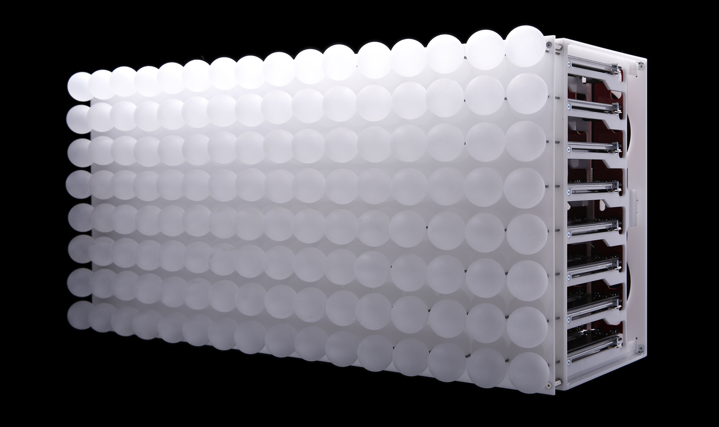 The firmware receives RS-485 commands for position from a TCP to RS-485 device - this allows each 8x8 array box to have an IP address that it receives data on for simple scalability
